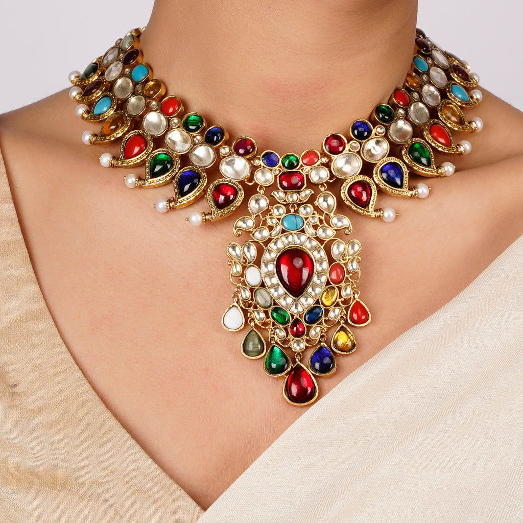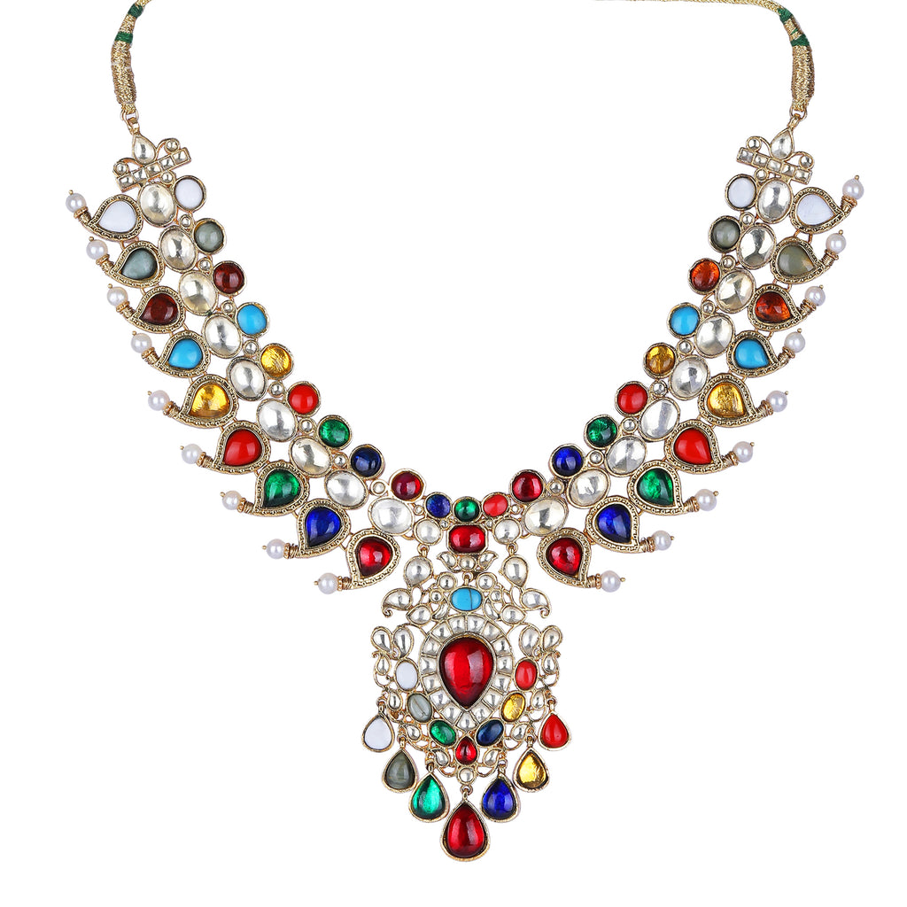Details Size : Necklace L-16"XW-5.2" Earring L-2.6"XW-1.3" Stone Setting : Kundan String(s) : Drop(s) : Finish : Gold Finding : Dori &...