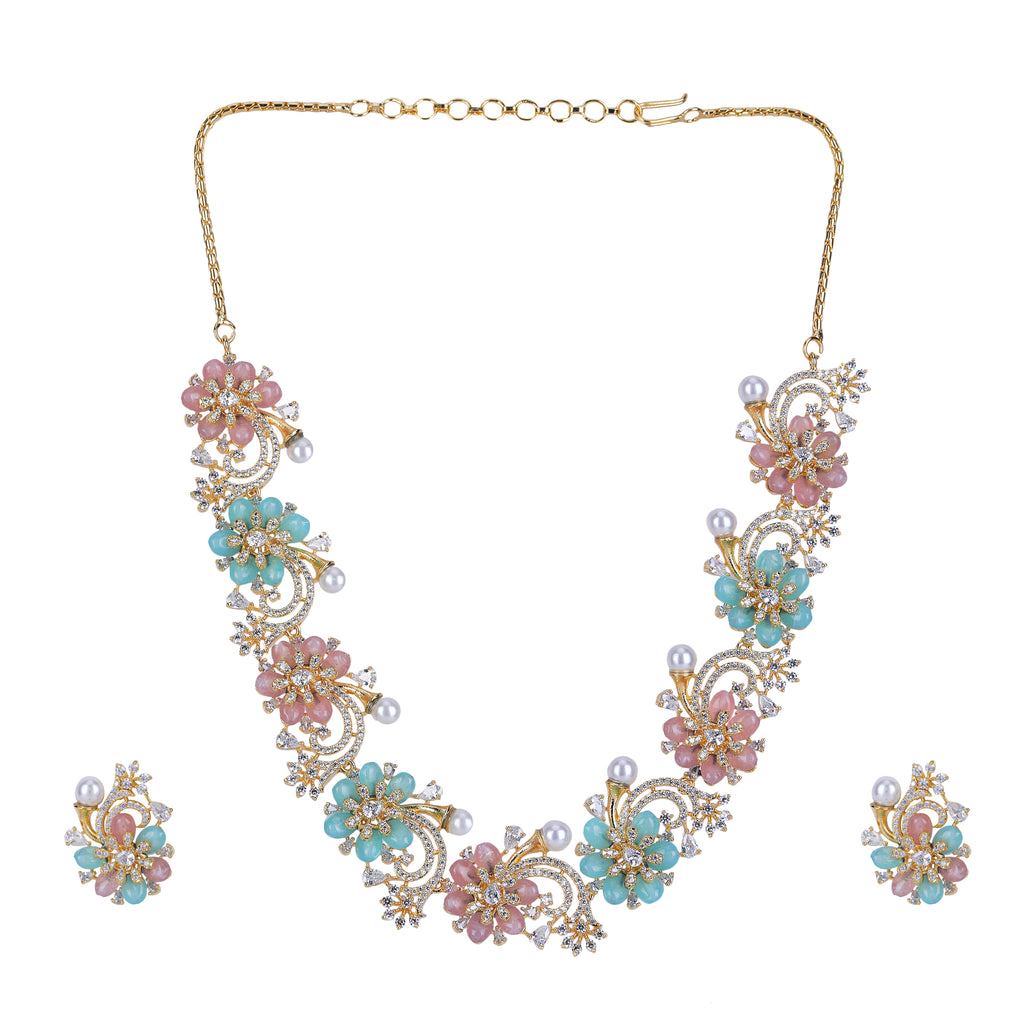 Details Size : Necklace L-10"XW-0.5" Earring L-1.4"XW-0.5" Stone Setting : Zircon String(s) : Aquamrine Drop(s) : Finish : Gold Finding : Hook...