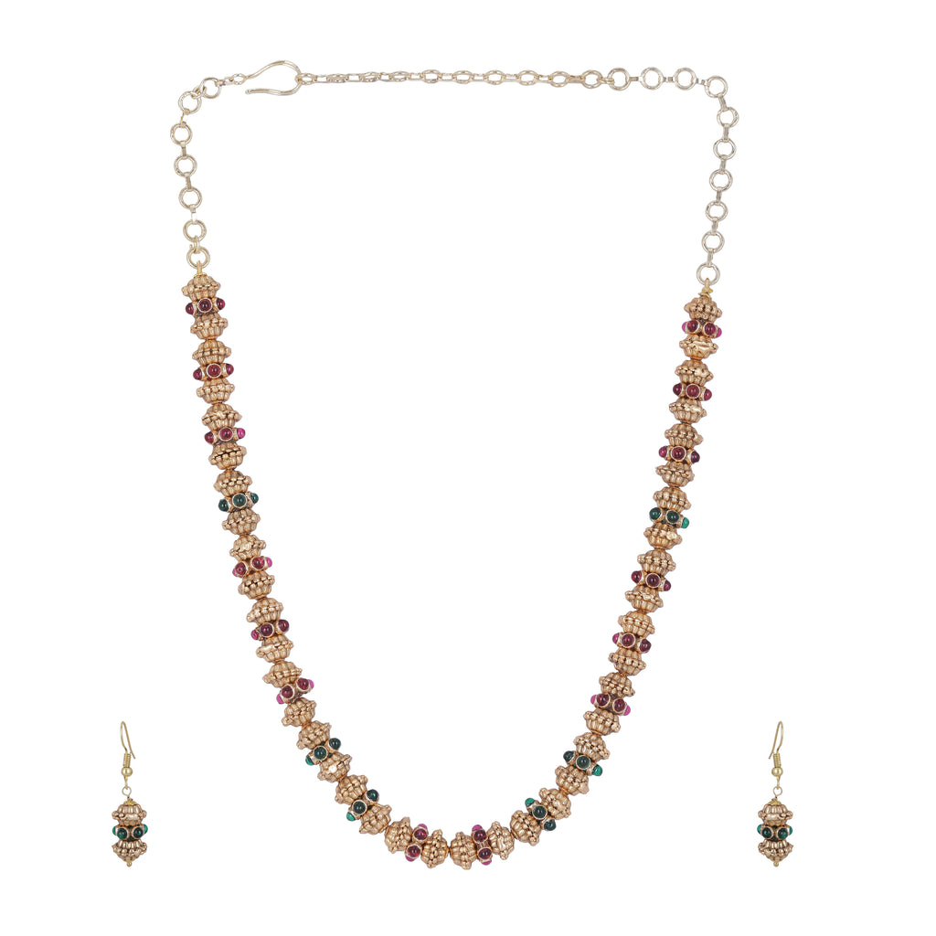 Details Size : Necklace L-19"XW-0.8" Earring L-0.7"XW-0.7" Stone Setting : Zircon String(s) : 22k Gold Plated Chain Drop(s) : Finish : Gold...