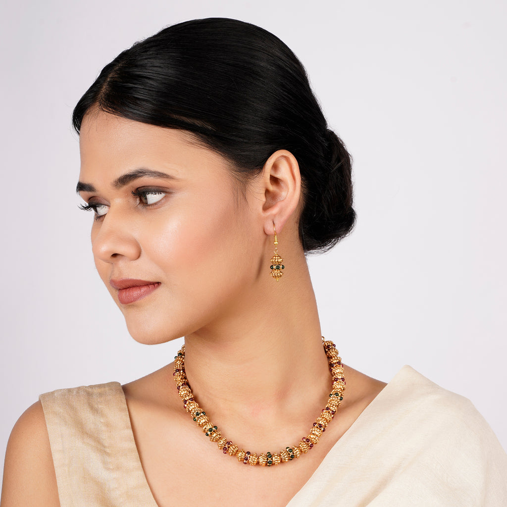 Details Size : Necklace L-8"XW-1.8" Earring L-0.7"XW-0.4" Stone Setting : Zircon String(s) : Drop(s) : Finish : Gold Finding : Hook Link...