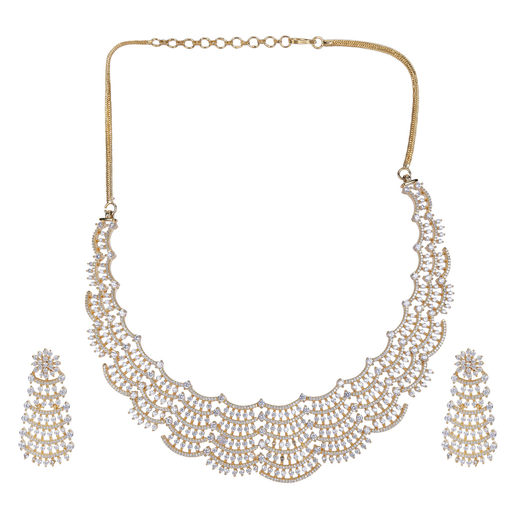 Details Size : Necklace L-19"XW-0.8" Earring L-0.7"XW-0.7" Stone Setting : Zircon String(s) : 22k Gold Plated Chain Drop(s) : Finish : Gold...