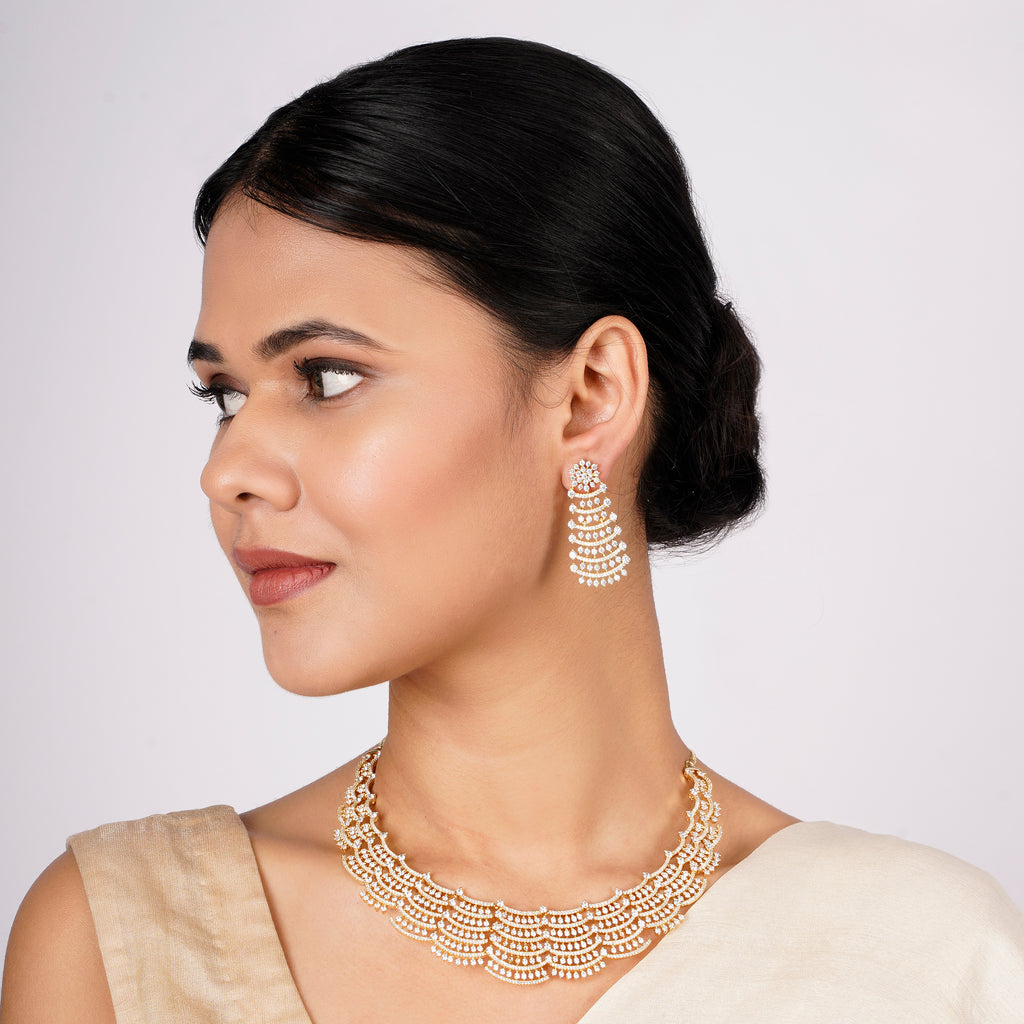 Details Size : Necklace L-8"XW-1.8" Earring L-0.7"XW-0.4" Stone Setting : Zircon String(s) : Drop(s) : Finish : Gold Finding : Hook Link...
