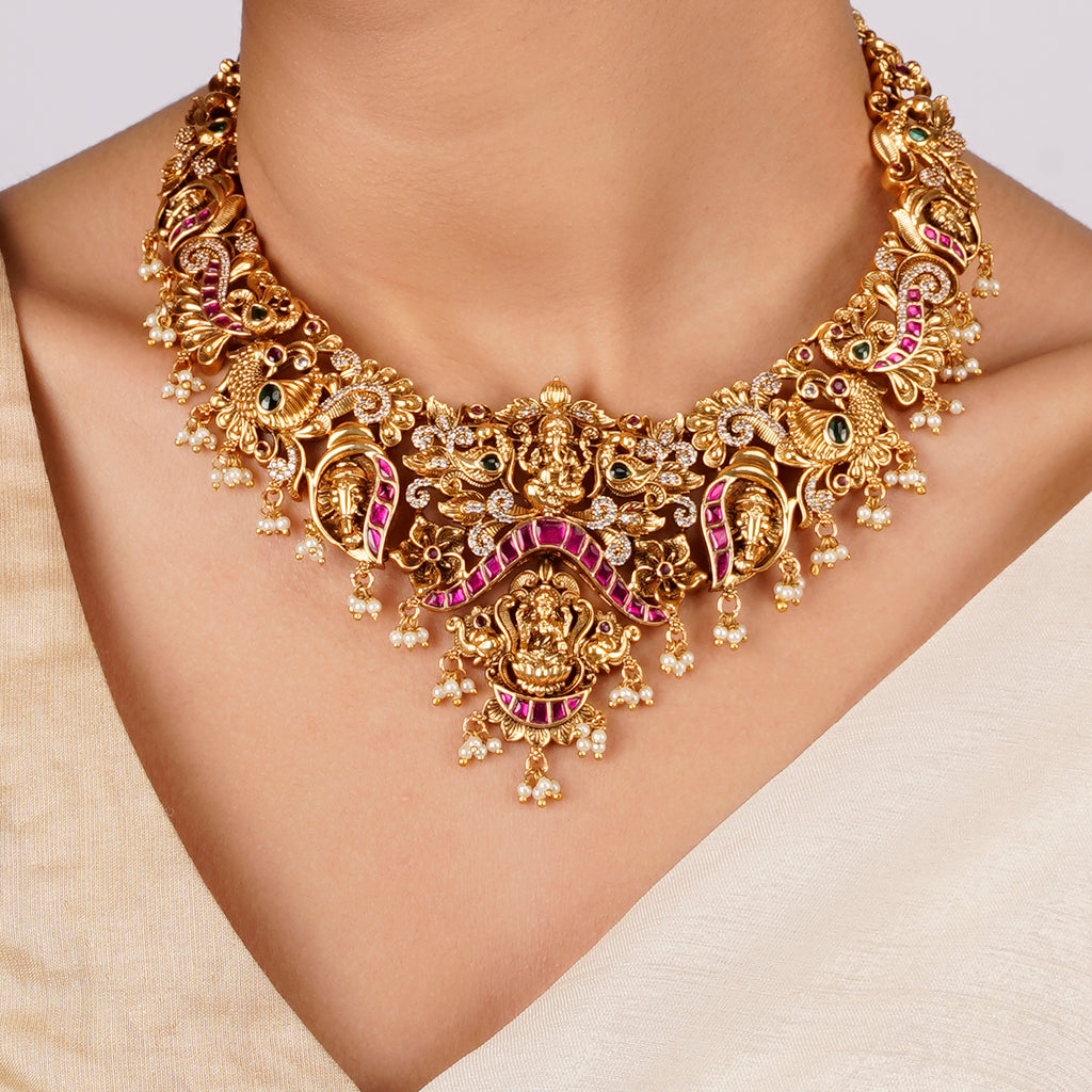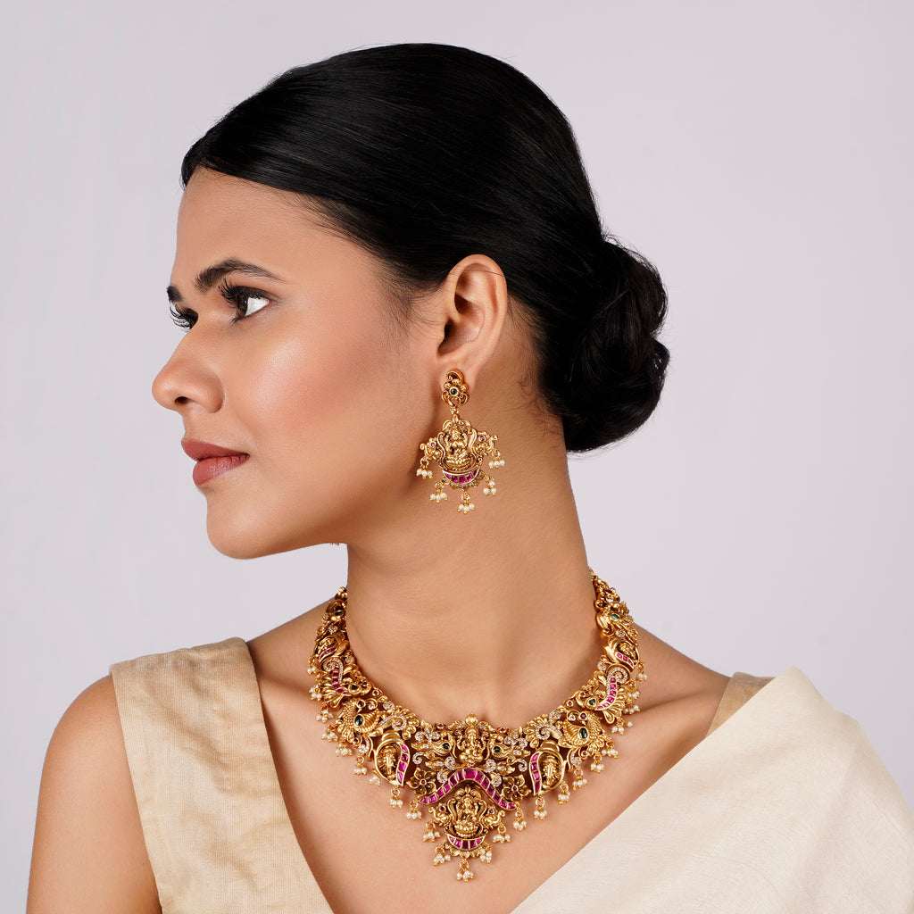 Details Size : Necklace L-22"XW-4.2" Earring L-1"XW-1" Stone Setting : Moissanite String(s) : Drop(s) : Finish : Gold Finding : dori &...