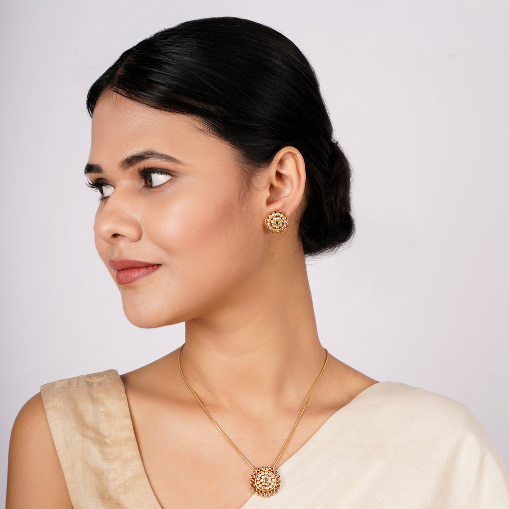 Details Size : Necklace L-19"XW-0.8" Earring L-0.7"XW-0.7" Stone Setting : Zircon String(s) : 22k Gold Plated Chain Drop(s) : Finish : Gold...