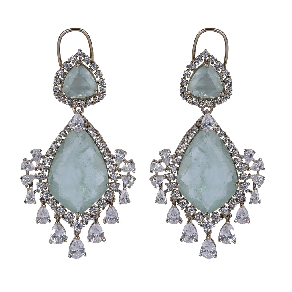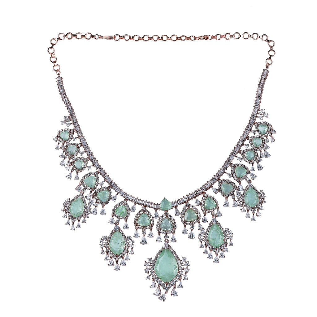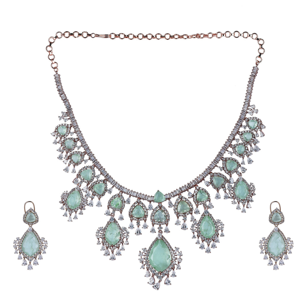 Details Size : Necklace L-10"XW-0.5" Earring L-1.4"XW-0.5" Stone Setting : Zircon String(s) : Aquamrine Drop(s) : Finish : Gold Finding : Hook...