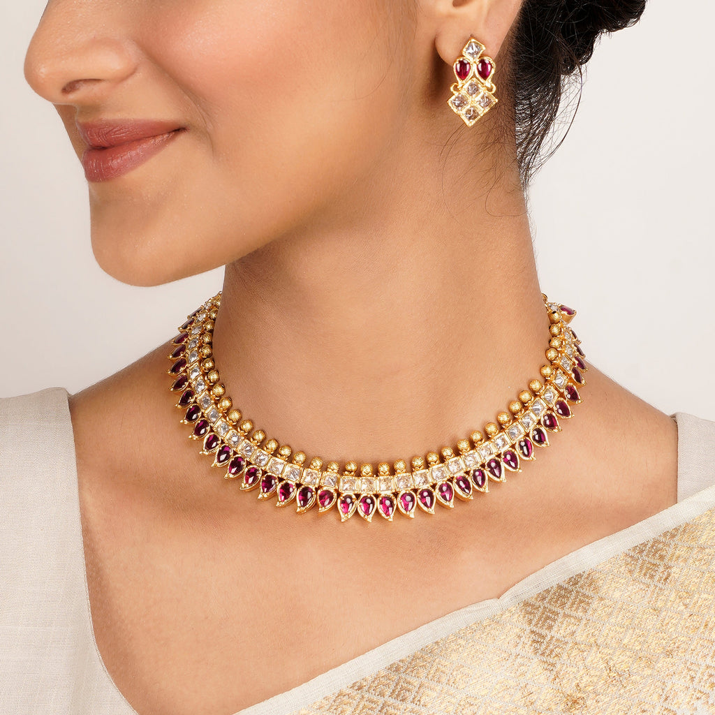 Details Size : Necklace L-21" X W-1.6" Earring L-1.3" X W-0.8" Stone Setting : Ruby String(s) : Drop(s) : Finish : Gold...