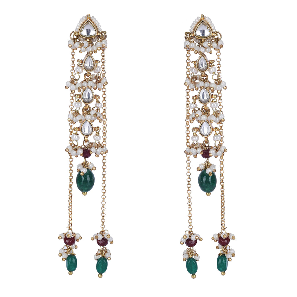 Details Size : Earring L 3" X W .02" Stone Setting : Kundan String(s) : Drop(s) : Fresh Water Pearl Finish : Gold Finding : Push Back Art Karat Jewelry is plated with 22k gold, studded with precious, semi-precious and...