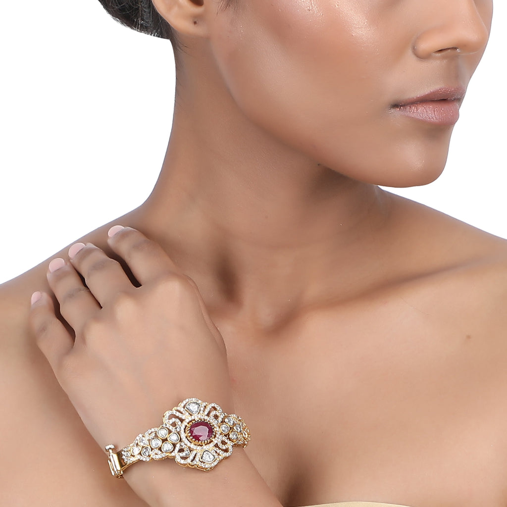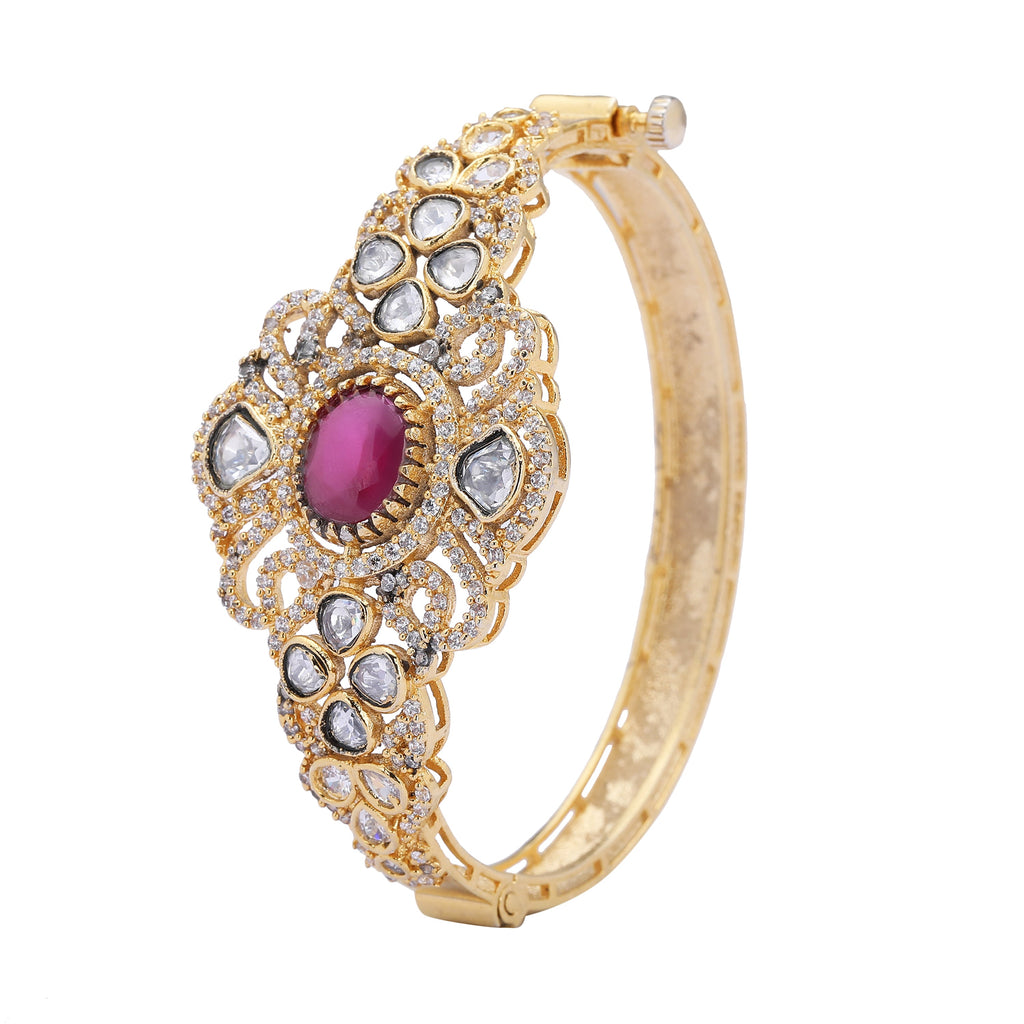 DETAILS Size: N- 16"L X 1.5"W E-1.4" L X .75"W Stone Setting: Zircon & Ruby String(s): Pink Quartz Drop(s): Pink Quartz Finish: Victorian Finding: Hook & Links Art Karat Jewellery is plated with 22k gold, studded with precious, semi-precious...