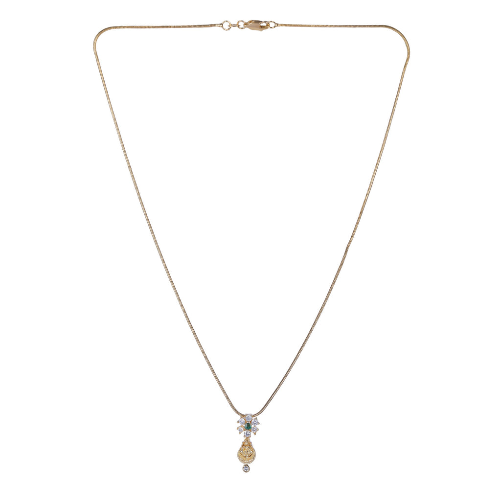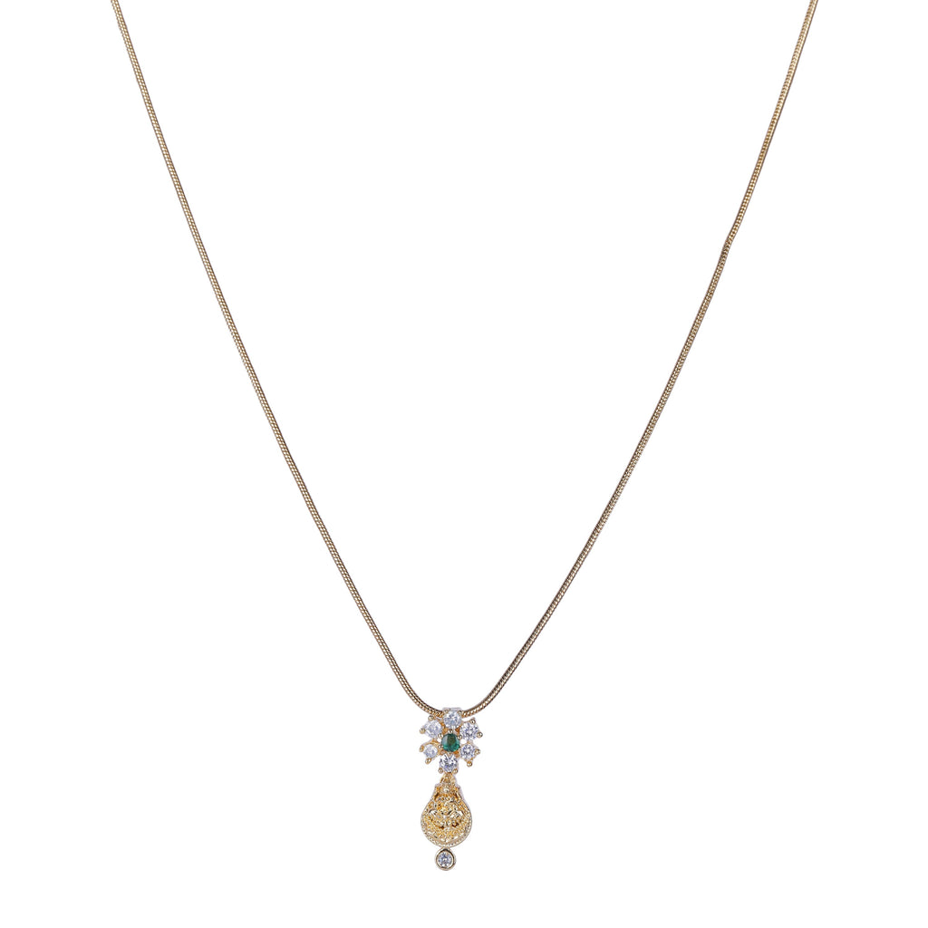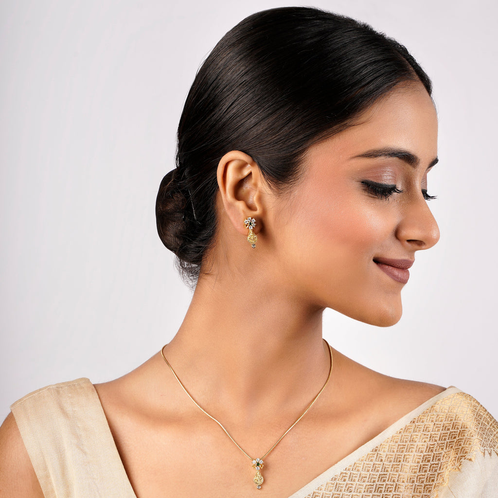 Details Size : Necklace L-19"XW-0.6" Earring L-0.5"XW-0.3" Stone Setting : Zircon String(s) : 22k Gold Plated Chain Drop(s) : Finish : Gold...