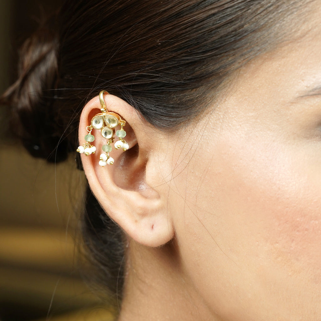 Details Size : Earcuff L-.8" W-.08" Stone Setting : Kundan String(s) : Drop(s) : Fresh Water Pearls Finish : 22k Gold Plated Finding : Clip Art Karat Jewelry is plated with 22k gold, studded with precious, semi-precious and natural gemstones....