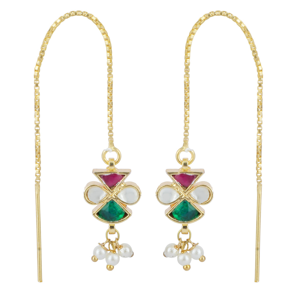 Details Size : Earring L-3.1"X W-0.3" Stone Setting : Kundan String(s) : Drop(s) : Fresh water Pearl Finish : Gold Finding : Sui Dhaga Chain Art Karat Jewelry is plated with 22k gold, studded with precious, semi-precious and natural gemstones....
