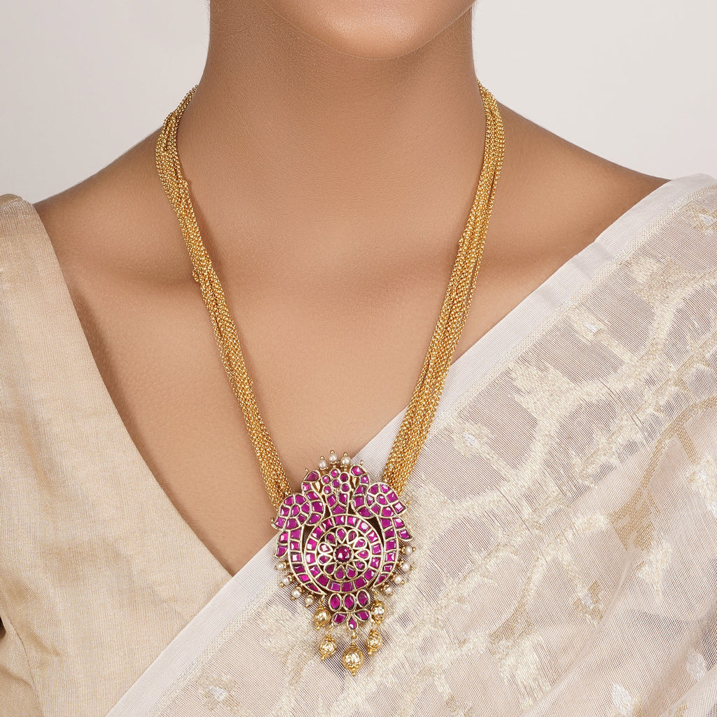 Details Size : Bracelet L-7.5"XW-.8" Stone Setting : Kundan String(s) : Taarmoti Drop(s) : Ruby Finish : 22K Gold Plated Finding :...
