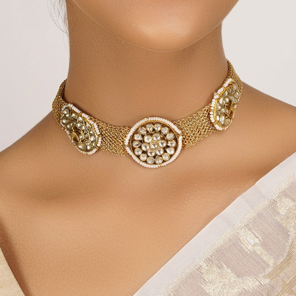 Details Size : Necklace 10"XW 1.3" Earring L 1"X W1" Stone Setting : Kundan String(s) : Drop(s) : Finish : 22K Gold Plated Finding : Hook Link & Push BACK Art Karat Jewelry is plated with 22k gold, studded with...