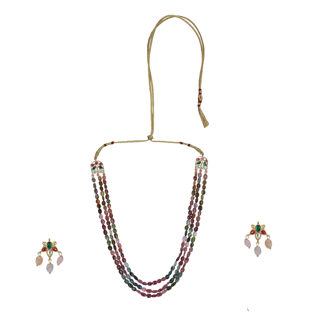 Details Size : Necklace L-22" X W-1.3" Earring L-1"XW- .2" Stone Setting : Kundan String(s) : Gold chain & Rosequartz Drop(s) :...