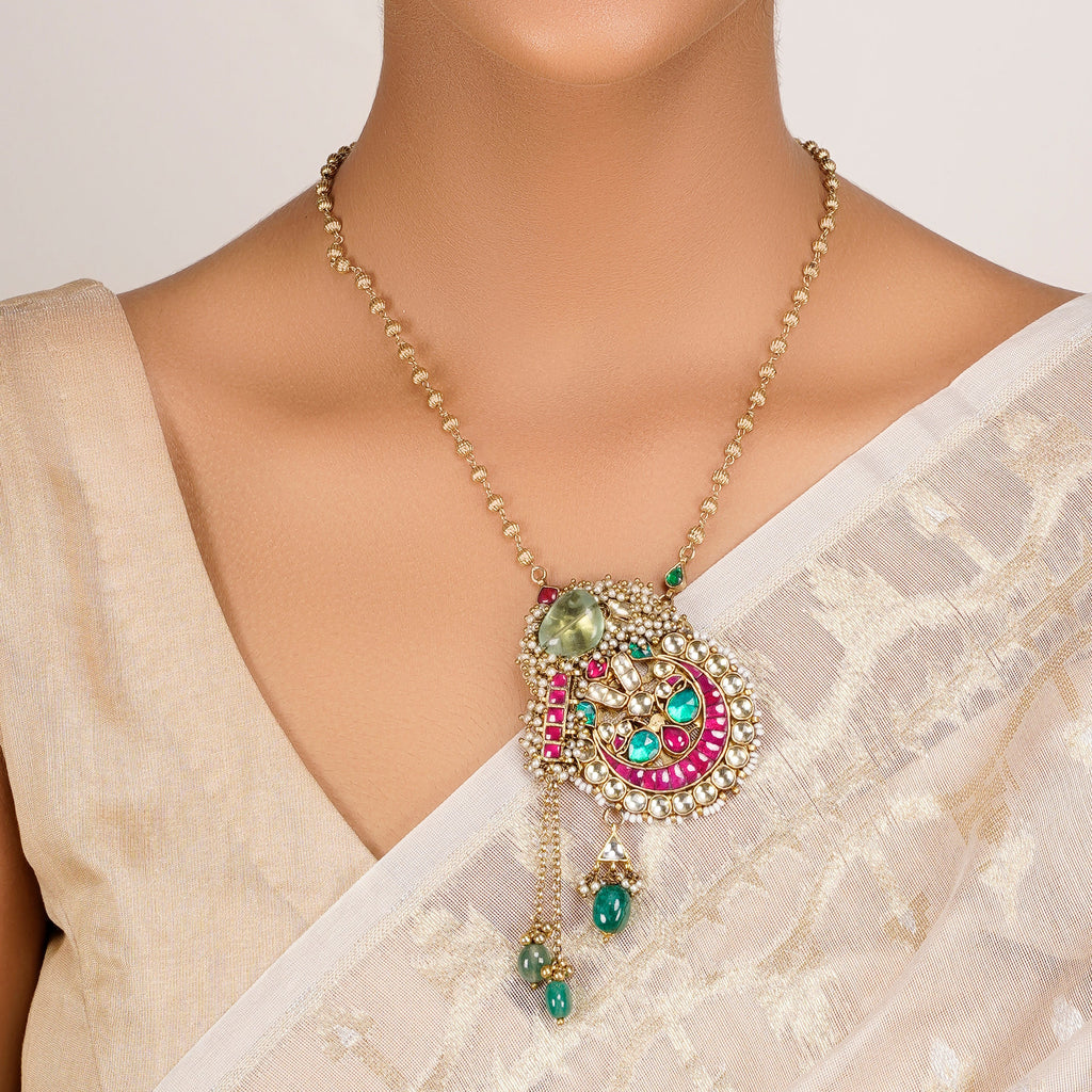 Details Size : Necklace L-22" X W-1.3" Earring L-1"XW- .2" Stone Setting : Kundan String(s) : Gold chain & Rosequartz Drop(s) :...