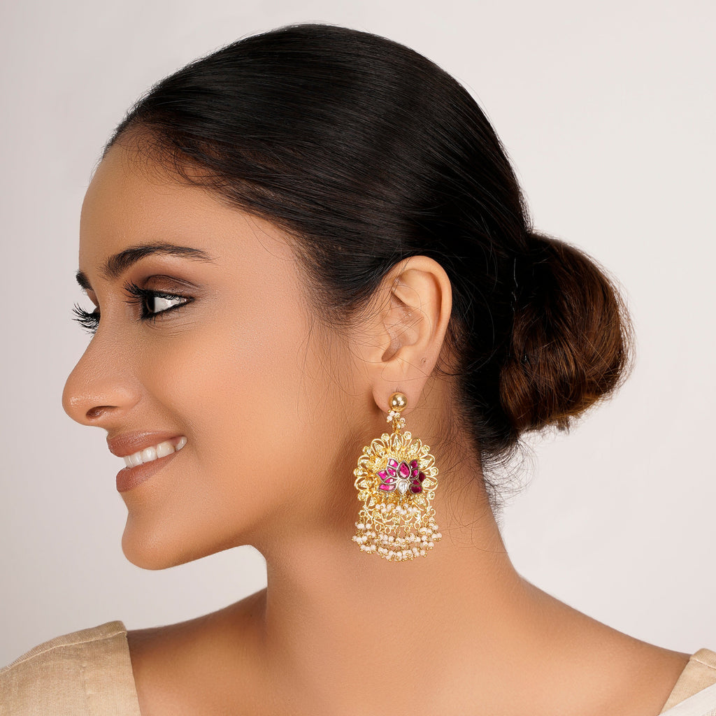 Details Size : Bracelet L-7.5"XW-.8" Stone Setting : Kundan String(s) : Taarmoti Drop(s) : Ruby Finish : 22K Gold Plated Finding :...