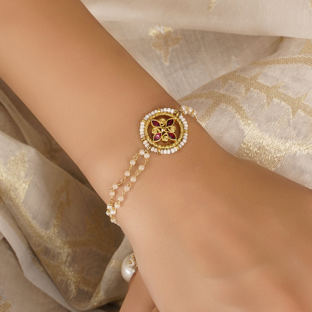 Details Size : Bracelet L-7.5"XW-.8" Stone Setting : Kundan String(s) : Taarmoti Drop(s) : Ruby Finish : 22K Gold Plated Finding :...