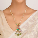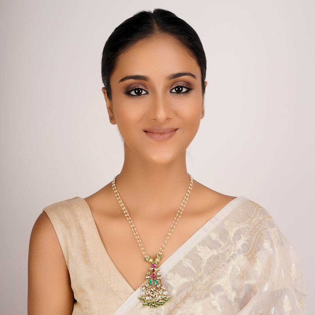 Details Size : Necklace L-22" X W-1.3" Earring L-1"XW- .2" Stone Setting : Kundan String(s) : Gold chain & Rosequartz Drop(s) :...