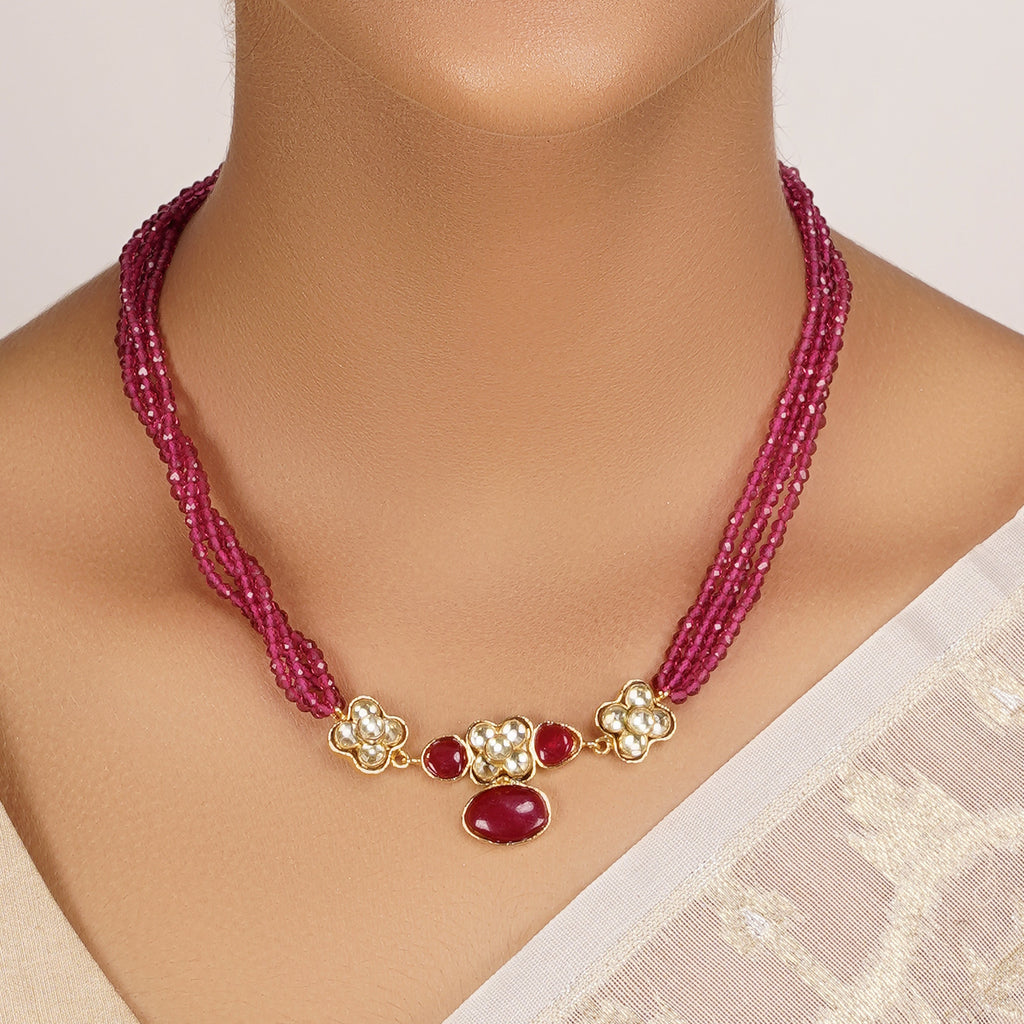 Details Size : Necklace L-22" X W-1.3" Earring L-1"XW- .2" Stone Setting : Kundan String(s) : Gold chain & Rosequartz Drop(s) :...