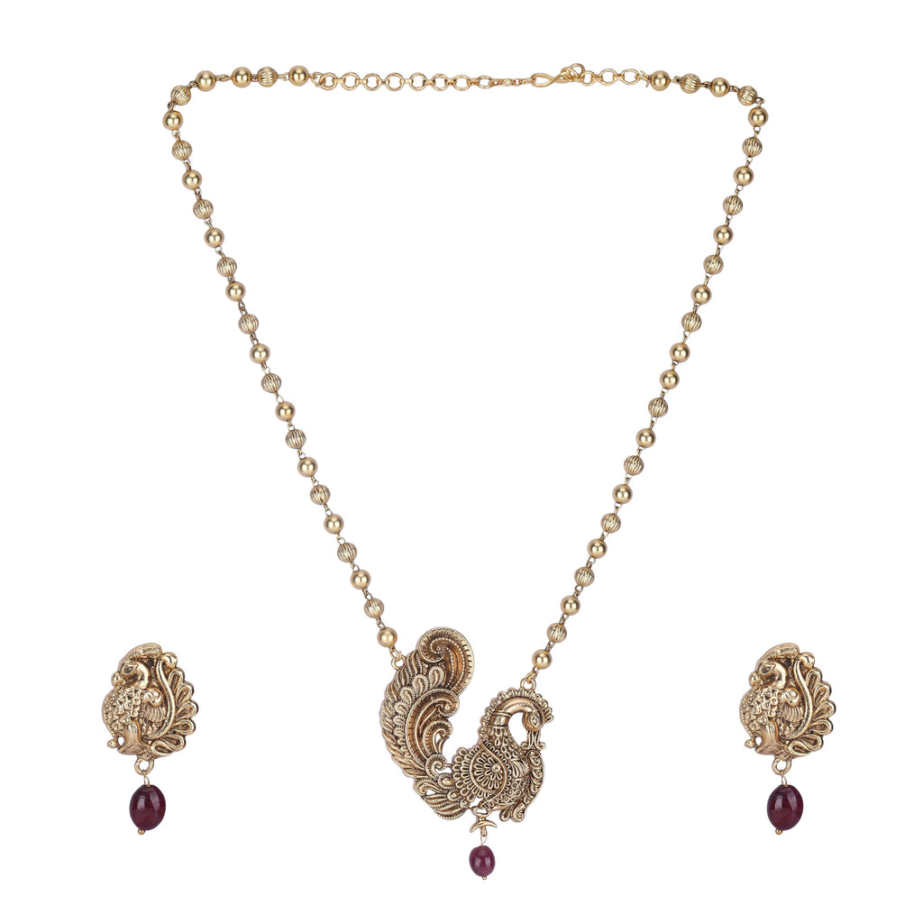 Details Size : Necklace L-20" X W-1.3" Earring L-1" X W-0.7" Stone Setting : Ruby String(s) : Drop(s) : Finish : Gold...