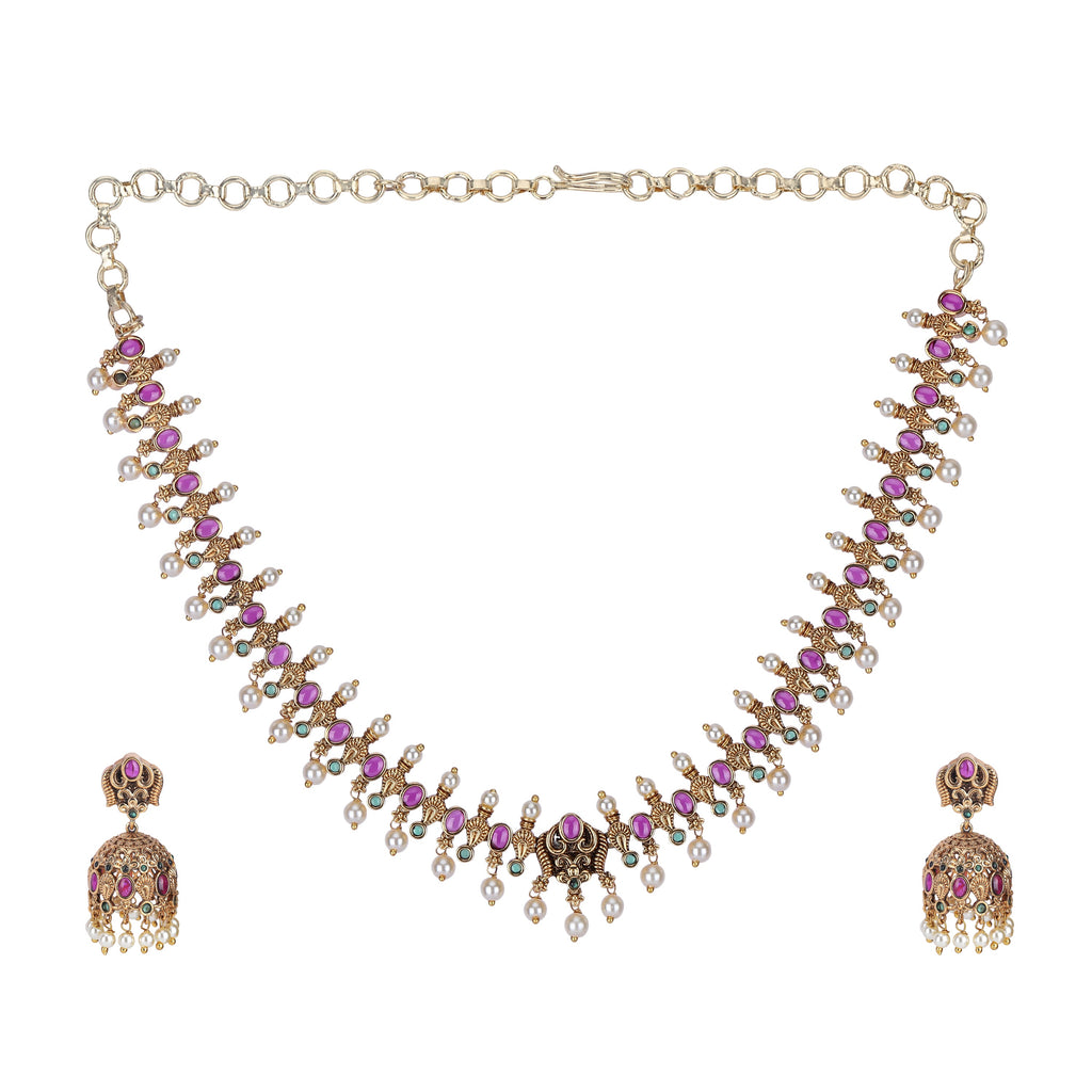 Details Size : Necklace L-21" X W-1.6" Earring L-1.3" X W-0.8" Stone Setting : Ruby String(s) : Drop(s) : Finish : Gold Plated Finding : Hook Link& Push Back Art Karat Jewelry is plated with 22k gold, studded with precious,...