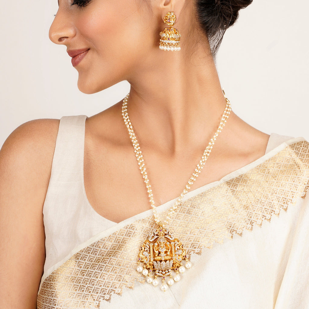 Details Size : Necklace L-9" X W-0.5" Earring L-0.7" X W-0.3" Stone Setting : Zircon String(s) : Drop(s) : Fresh Water Pearl Finish : Gold Plated Finding : Hook Link& Push Back Art Karat Jewelry is plated with 22k gold,...