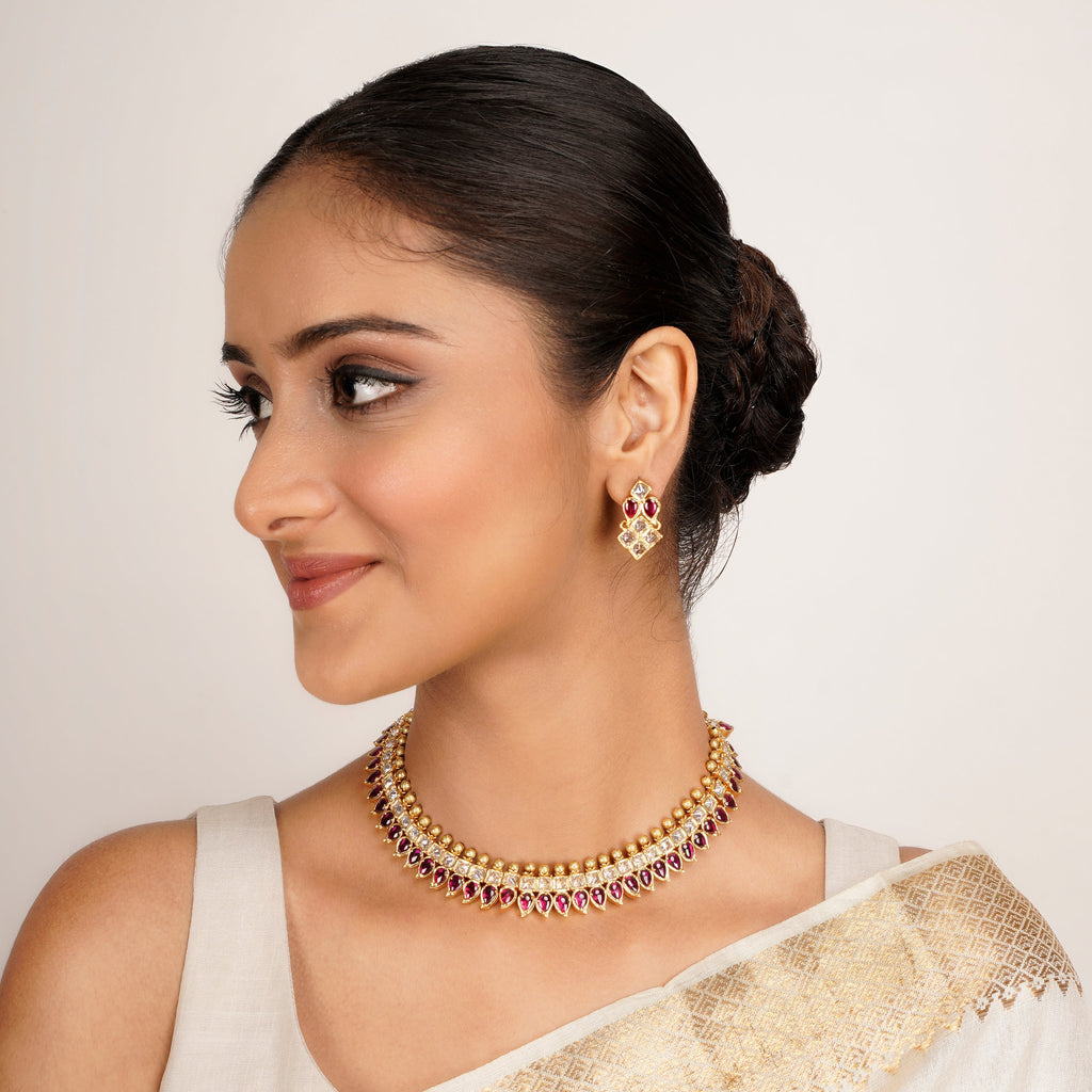 Details Size : Necklace L-21" X W-1.6" Earring L-1.3" X W-0.8" Stone Setting : Ruby String(s) : Drop(s) : Finish : Gold...