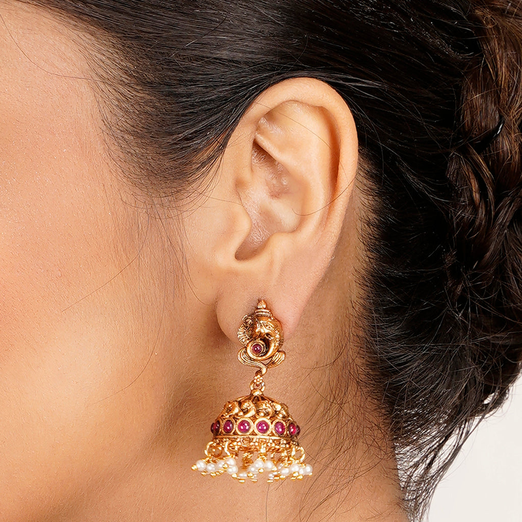 Details Size : Necklace L-21" X W-1.6" Earring L-1.3" X W-0.8" Stone Setting : Ruby String(s) : Drop(s) : Finish : Gold...
