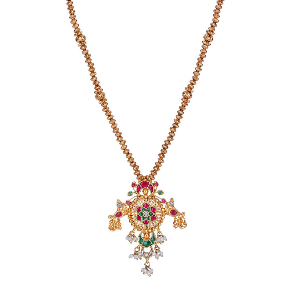 Details Size : Necklace L-19"X W- 0.5" Stone Setting : Kundan String(s) : chain Drop(s) : Finish : 22K Gold Plated Finding : Hook Link Art Karat Jewelry is plated with 22k gold, studded with precious, semi-precious and natural gemstones....