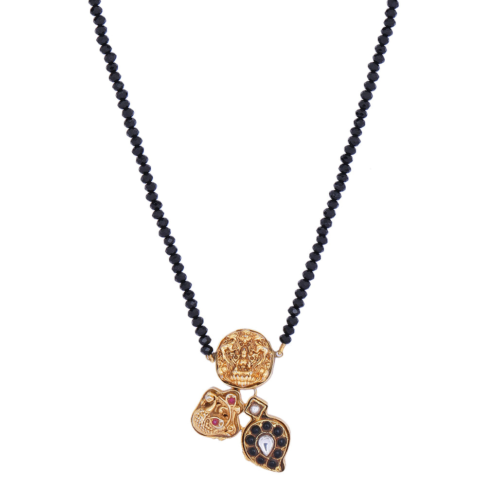 Details Size : Necklace L-19" W-0.5" Stone Setting : Zircon String(s) : Mangalsutra Drop(s) : Finish : 22k Gold Plated Finding : Hook & Links Art Karat Jewelry is plated with 22k gold, studded with precious, semi-precious and natural gemstones....