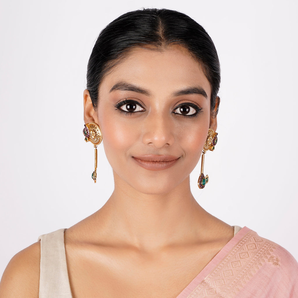 Details Size : Earring - 2.2"L X0.5"W Stone Setting : Kundan String(s) : Drop(s) : Fluoride Finish : 22k Gold Plated Finding : Push Back Art Karat Jewelry is plated with 22k gold, studded with precious, semi-precious and natural gemstones....