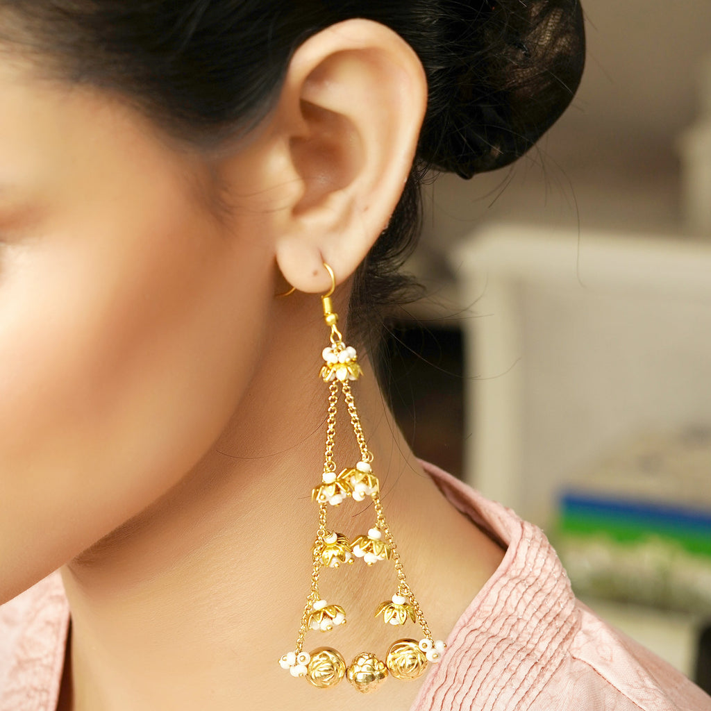 Details Size : Earring - 1.5”L X0.2”W Stone Setting : String(s) : 22k Gold Plated Chain Drop(s) : Fresh Water Pearls Finish : 22k Gold Plated Finding : Hook Art Karat Jewelry is plated with 22k gold, studded with precious,...