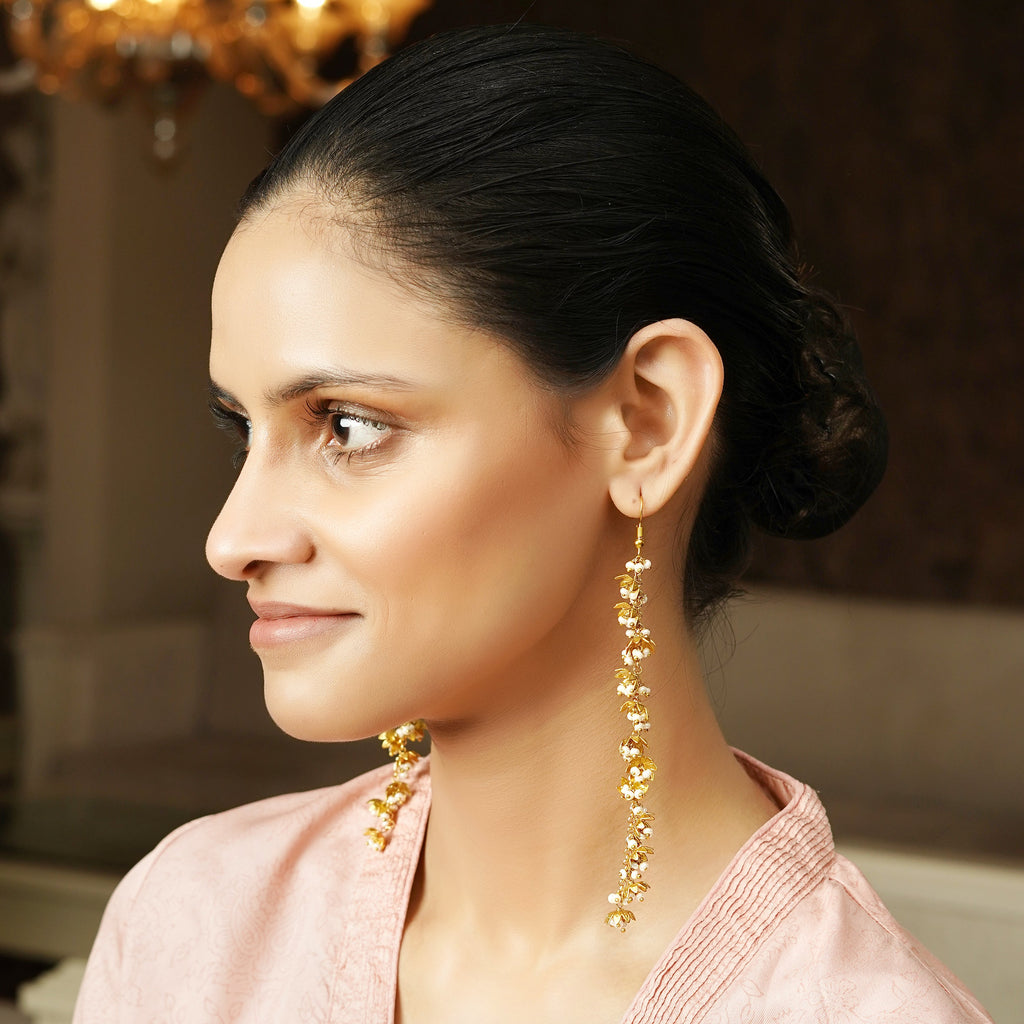 Details Size : Earring - 1.5”L X0.2”W Stone Setting : String(s) : 22k Gold Plated Chain Drop(s) : Fresh Water Pearls Finish : 22k Gold Plated Finding : Hook Art Karat Jewelry is plated with 22k gold, studded with precious,...
